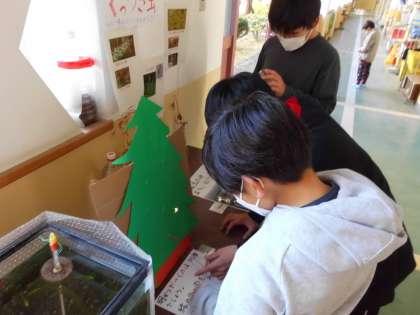 理科コーナーにクリスマスツリーのイルミネーションを確かめる展示を用意しました。3本の線のうち豆電球が光るのはどれかを試してみるのですが,さすが,6年生は,配線を確かめて,明るく点灯するわけを確かめていました。