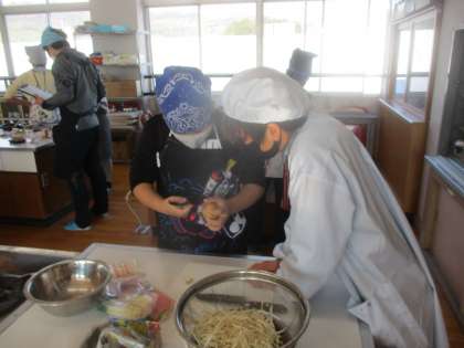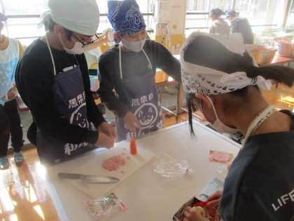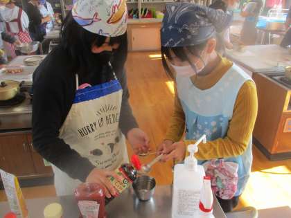 調理が始まりました。相談しながら食材を切ったり,調味料を間違えないように量ったりしていました。