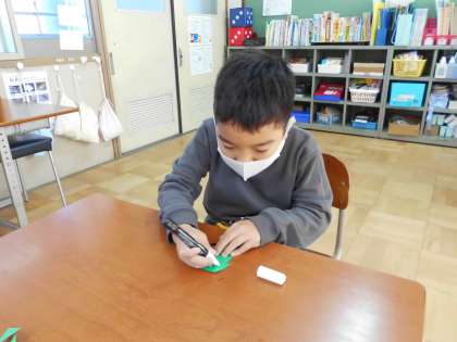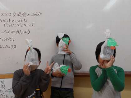 だしものの練習と,プレゼント作りをしました。プレゼントはまつぼっくりで作ったツリーです。きれいにラッピングして,カードを書いてできあがり。