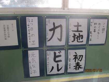 京都市小学校児童「書き初め展」に出展した作品を職員室前に掲示しています。
