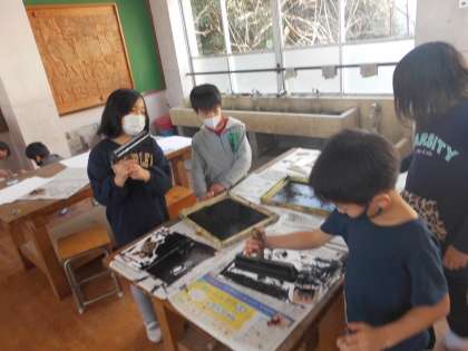 インクがうまくつかなかったり,台紙につけていたものが取れてしまったりと,思い通りにいかないところも出てくる場面がありましたが,何度か回数を重ねて,刷っていく中で,徐々にコツを掴んでいっているようでした。