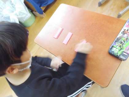その後は,キャンディーの数を数えたり,言われた数字を数え棒で表したりして大きい数を10のまとまりがいくつで,ばらがいくつかで表すことに慣れました。