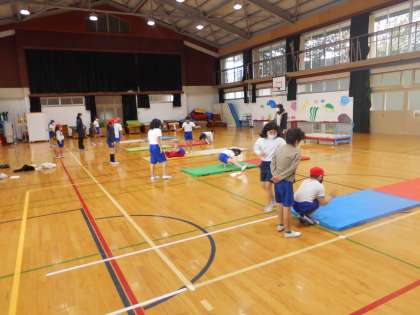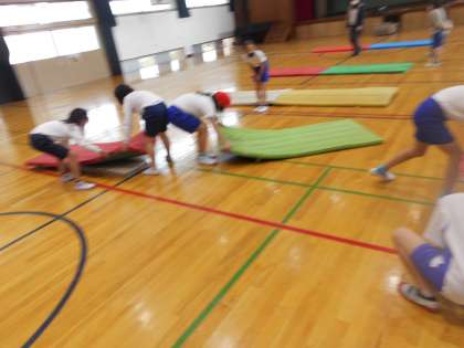 今は「前転」「後転」「開脚前転」「開脚後転」「側転」を練習しています。