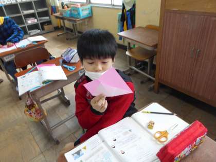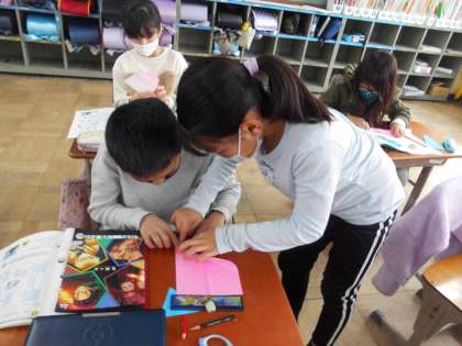 三角形の学習で色紙を使って,折ったり,切ったりしながら二等辺三角形や正三角形を作りました。
