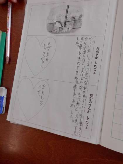 たぬきとおかみさんがしたことを読み,それぞれがどんな気持ちだったかを考えました。