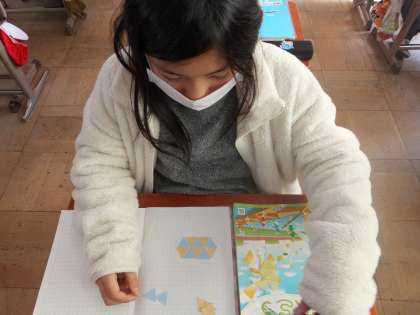 同じ形の三角形を何個も使って,模様を作りました。