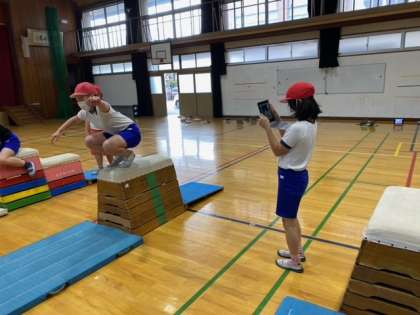 がんばればとび越すことができそうなとび方に挑戦しています。友達に見てもらいながら,気を付けるポイントを意識して練習しました。