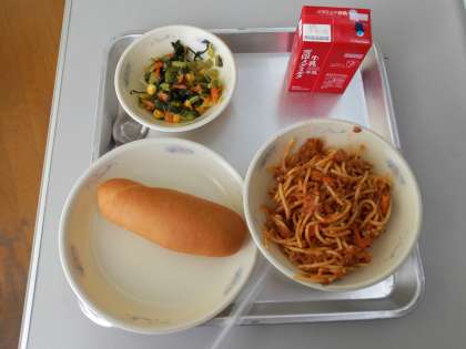 給食のメニューは,小型コッペパン,牛乳,スパゲティーのミートソース煮,小松菜のソテーでした。