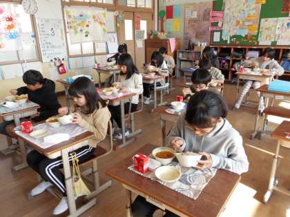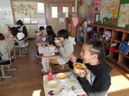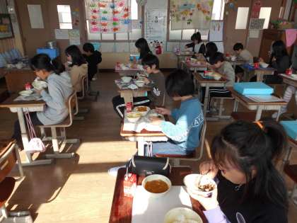 食の学習で,バランスよく食べることについて学習しました。早速,今日の給食「チキンカレー,ひじきのソテー,ごはん,牛乳」のバランスのよさについて考えながらたいただいていました。