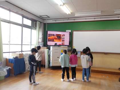 こまを回したことがある子が少なく,できる友達に一生懸命やり方を聞いたり,テレビに写した動画を見ながら挑戦したりしていました。