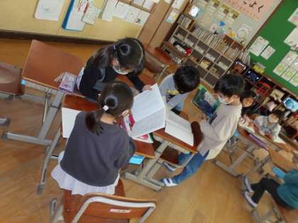 1人の子が,「たのしいな,ことばあそび」のページにヒントがあると発見したのをきっかけに,次々とクイズを考えていました。
