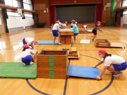 体育で「とび箱運動」の学習をしています。一人一人がてきぱきと動いて準備や片づけをしている姿は,とてもすばらしいです。