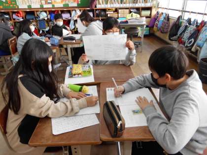 社会科で,自分のテーマについて調べたことを紙芝居にまとめて,グループで伝え合いました。自分しかそのテーマについて調べていないので,一人一人がしっかりと調べ,友達がわかるように伝え方を工夫して発表していました。