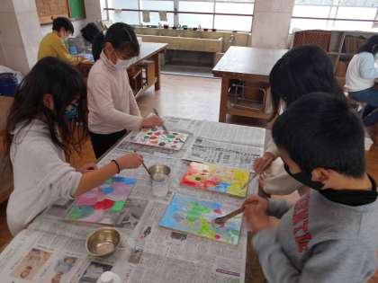 板に絵を描き,絵の具で色塗りをしました。