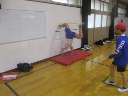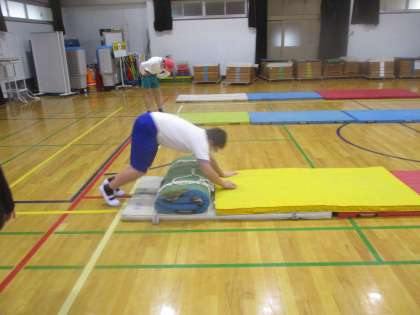 「マット運動」の学習に取り組んでいます。ねらい1では今できる技の連続や組み合わせに挑戦しています。グループの友達に見てもらい,アドバイスをしてもらって取り組んでいます。ねらい2では,新しい技に挑戦しています。様々な場を自分たちで工夫して練習しています。