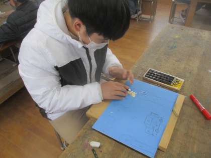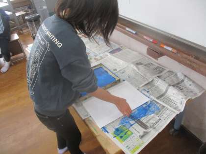 「版で広がる わたしの思い」の学習で版画に取り組んでいます。自分の思いに合わせて彫り方や刷り方を工夫しています。どんな素敵な作品ができるか楽しみです。