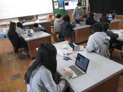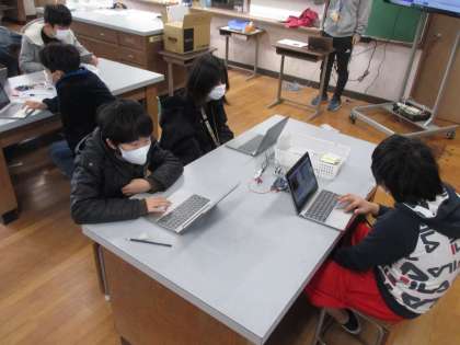 理科の「私たちの生活と電気」の学習で,電気をむだなく使う方法を考えながら,プログラミングを体験しています。