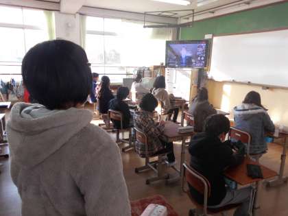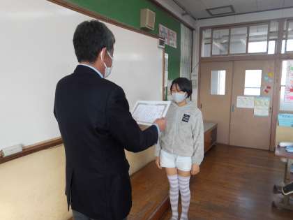 オンライン朝会で,書初め書写展の表彰がありました。その後,教室で一人ずつに賞状を校長先生からいただきました。