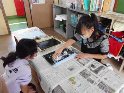 みんなが一生懸命に彫っていた木版画。ローラーにインクを付け,そっと紙を置き,バレンを使って丁寧に。遂に完成です!!一人一人の力作は校内作品展で展示します。お楽しみに。