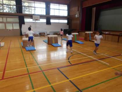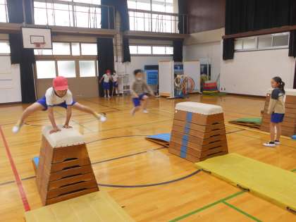 高さを調整しながら,縦横,それぞれの開脚とびに挑戦したり,新しく抱え込みとびに挑戦したりしています。