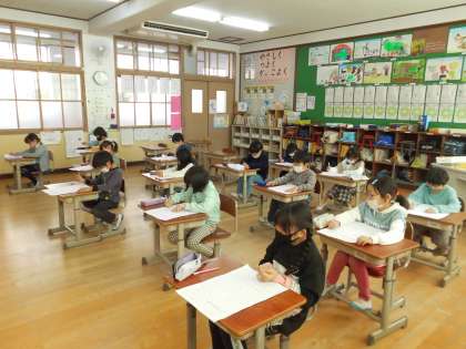 京都市の1年生が全員同じテストをすることを伝えると,いつもと違うテストに緊張していましたが,12月までに学習したことを思い出しながら,取り組んでいました。