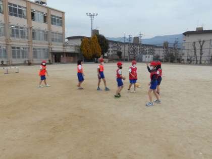 みんなで協力して,コートを作ったり,ゴールにするハードルを並べたりして,サッカーのゲームをしました。みんなよく動けていて,入りそうなボールを防いだり,こぼれたボールにいち早く追いかけたりと,男女を問わず活躍して楽しみました。