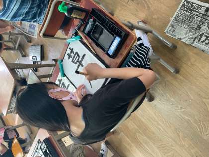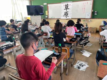 「たれ」の中と外の部分の組立てに気を付けて「草原」の文字を書きました。バランスに苦戦しながらも,何度も練習をし続けていました。