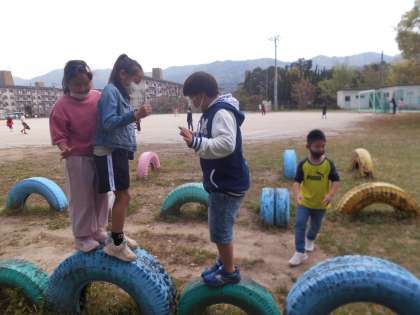 休み時間は,みんなで楽しく遊んでいます。遊具でドンじゃんけんをしたり,ドッチボールをしたりとそれぞれの休み時間を楽しんでいます。