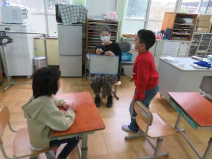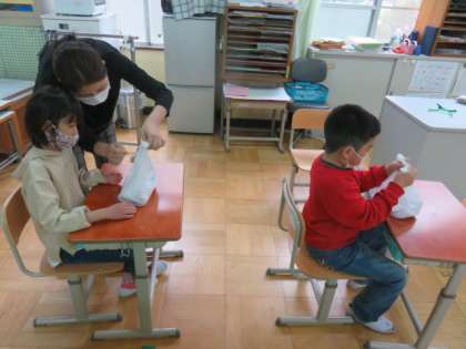 自立活動では袋を結ぶ練習と相手に上手に伝えるトレーニングのためのジェスチャーゲームをしました。