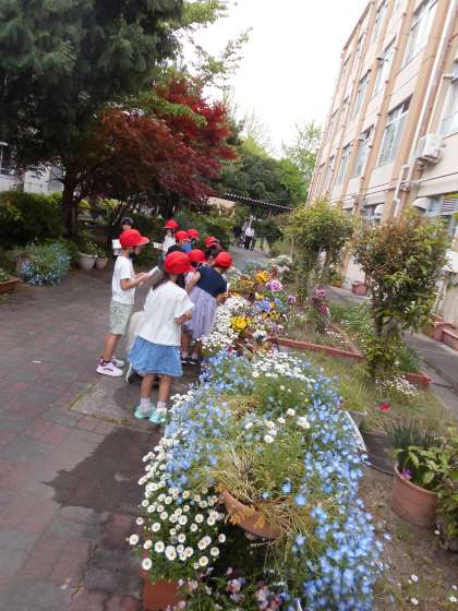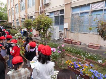 どんな花が好きか,どんな花を知っているかをみんなで出し合った後,学校にはどんな花が咲いているか探検しました。