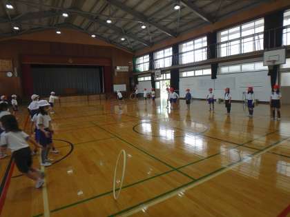 この日は音楽に合わせてリズム運動をしたり,フラフープを使って運動をしたりしました。