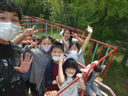 この日は総合遊具で遊びました。「ちょっと待って〜!」と子どもたちに置いて行かれるところでした。