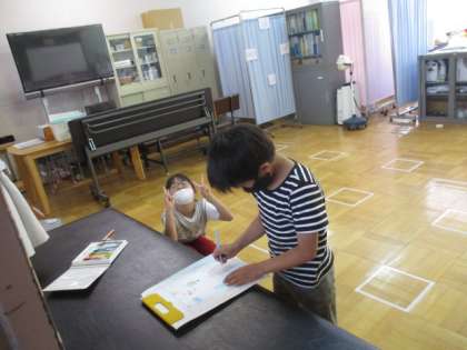 1年生との学校探検に向けて,各教室の紹介カードを作成しています。