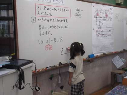 前回の20−8の計算の仕方を生かして,10のまとまりを使ってひき算をするとよいことに気づき,21を11と10に分けたり,20と1に分けたりしながら,計算をしました。