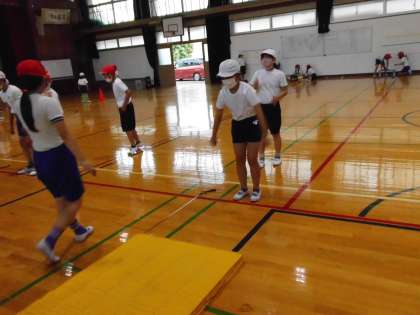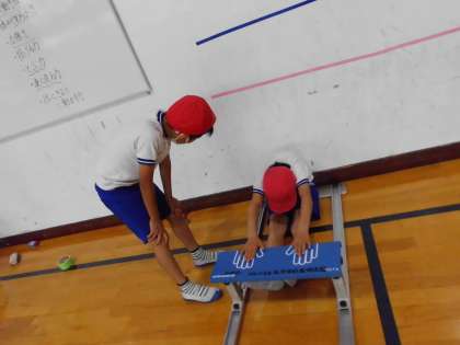 体育では,新体力テストにむけての練習をしました。立ち幅跳び,長座体前屈,反復横跳び,上体起こしに挑戦しました。