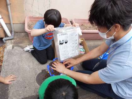 朝顔のたねを観察して,一人ずつ鉢に植えました。