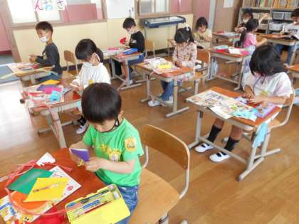 ちょきちょきかざりの学習では,好きな色の折り紙を選んで好きなかざりを作りました。工夫しながら楽しく取り組んでいました。