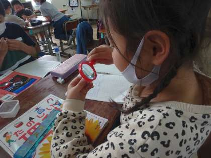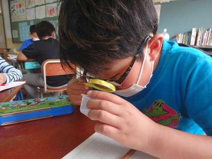 3年生で育てる植物の種を観察しました。虫眼鏡を使って,細かなところまで観察ができましたね!