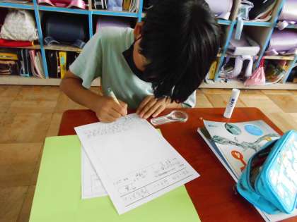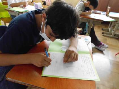 ツルレイシの種の観察をしました。大きさ・色・形・触りごこちなど,気づいたことを観察カードに記入しました。