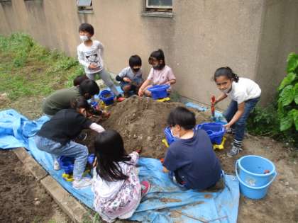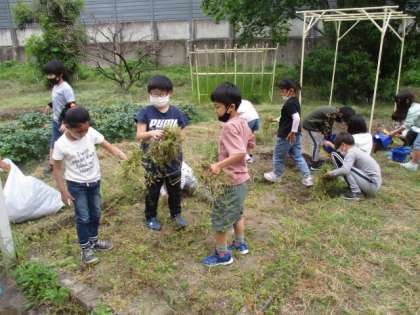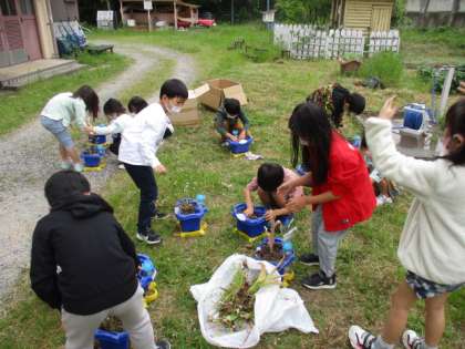 植木鉢に土を入れたり,畑の草抜きをしました。
