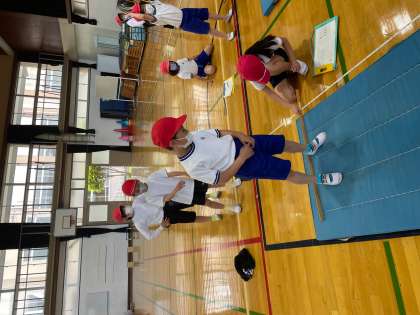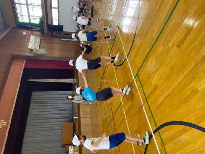 たてわりグループの,あいあいグループに分かれて2年・4年・5年生で新体力テストをしました。