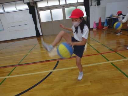 友達と話し合いながら,2つのフラフープを回したり,脚の下を通してドリブルをしたりといった工夫を考えていました!