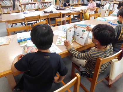 図書館には大型絵本もあり,知っている絵本でも大型だとまた違うようでみんなで集まって読んでいました。