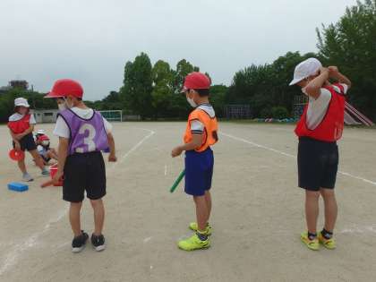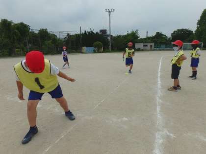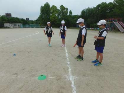 リレーの学習では,マーカーを使い,バトンをもらう時に走り出すタイミングの目印にしました。次の人が前を向いて走り出せるため,どのチームも記録が伸びたようです!