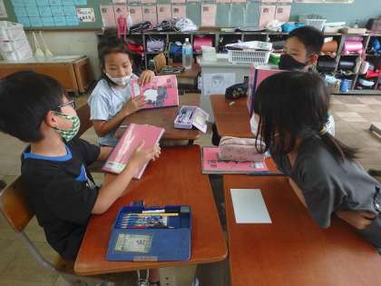 グループで自分が知らせたいことを伝え合いました。聞いている人は友達の話をしっかりと聞きながら,自分がもっと知りたいと思ったことに合わせて質問を考えました。前の時間に学習した「質問の種類」も参考にしながら質問をすることができました。
