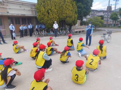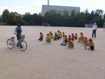 警察の方やボランティアの方にお世話になり,自転車安全教室を行いました。まずは,警察の方から自転車の乗り方を教えていただきました。安全に自転車に乗るためのルールをしっかりと聞くことができました。