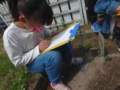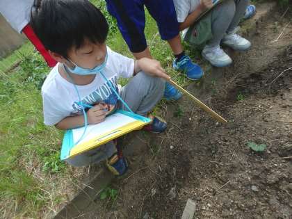 育てている植物の観察をしました。定期的に観察を行い,植物の高さは紙テープで記録していきます。