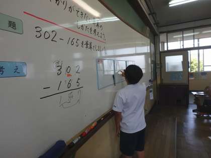 十の位が「0」になっている引き算の筆算のやり方を考えました。「まず」「次に」と,説明の仕方も上手になってきました。