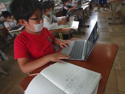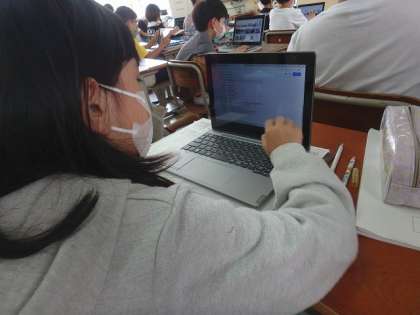 また,岡崎地域の様子について調べました。子どもたちは,タブレットや教科書を見ながら,自分たちの経験を進んで話していました。岡崎地域には「京都市〜」という施設がたくさんあります。たくさんのことを話し合うことで,岡崎地域には,たくさんの公共施設が集まっていることに気付くことができました。