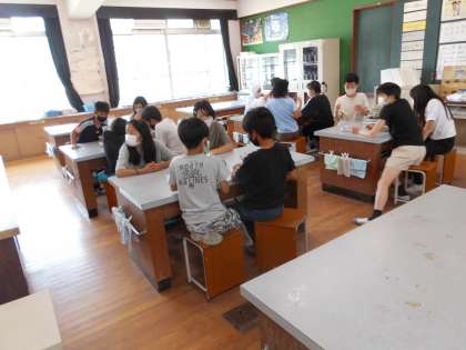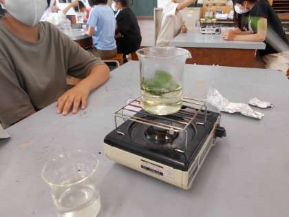 実験の準備をした葉を取ってきて,ヨウ素液ででんぷんが出来たのかを調べました。